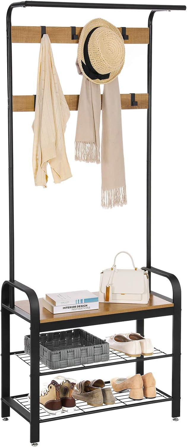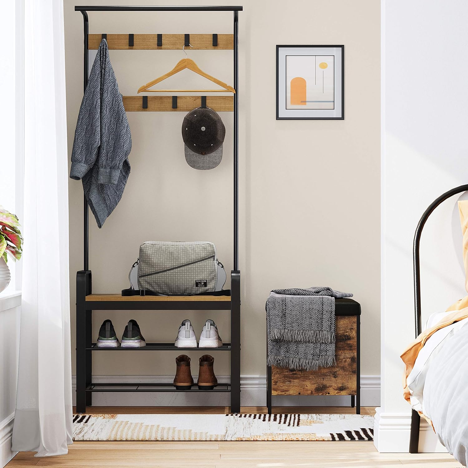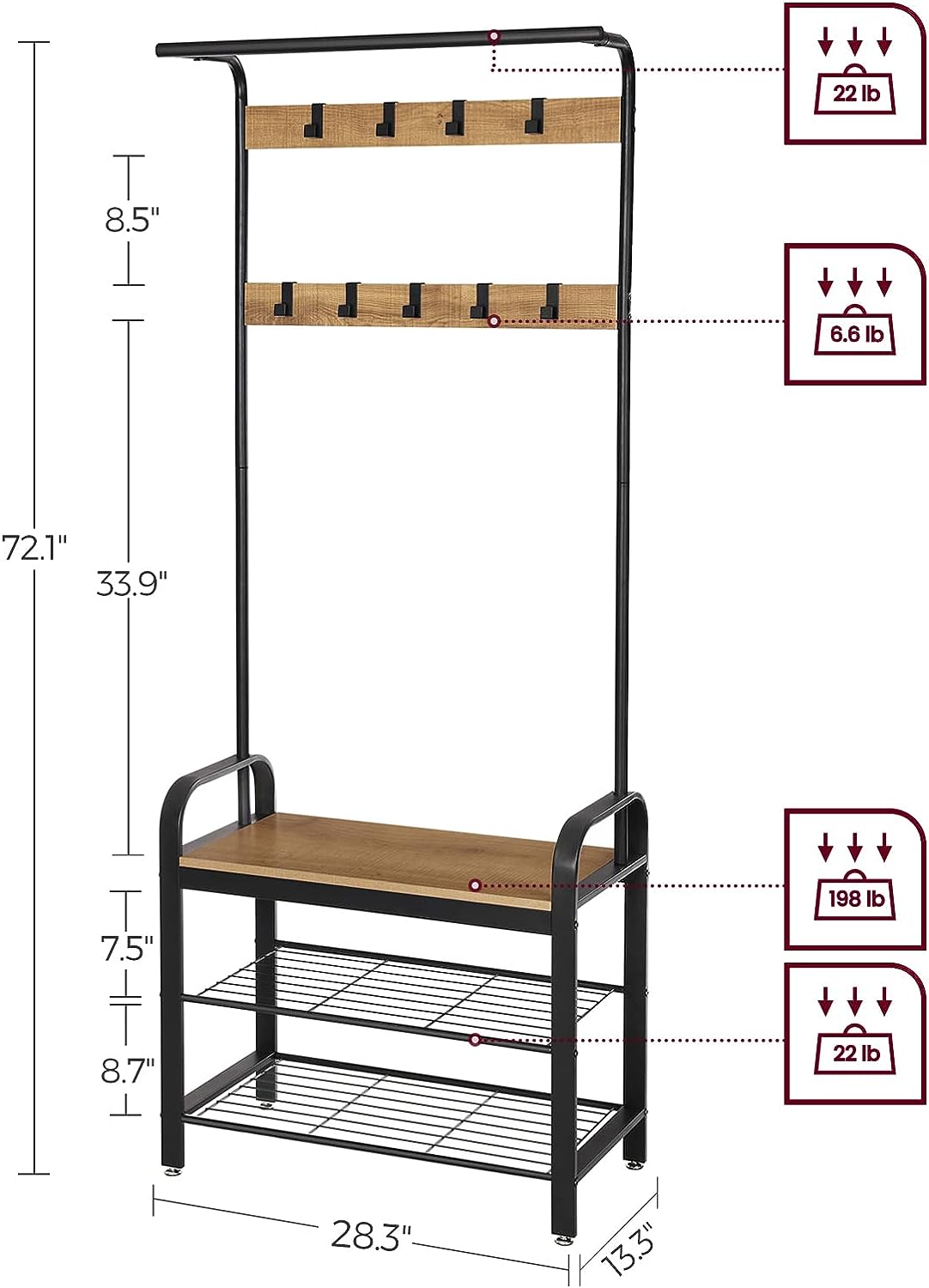 VASAGLE Coat Rack, Hall Tree with Shoe Bench for Entryway, Entryway Bench with Coat Rack, 4-in-1, with 9 Removable Hooks, a Hanging Rod, 13.3 x 28.3 x 72.1 Inches, Honey Brown and Black UHSR040B05Create a new description for this product from the title with 500 characters